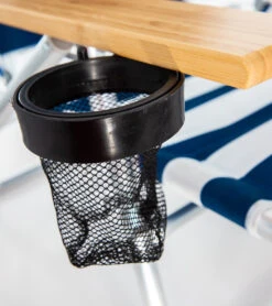 - Extra-wide wooden armrest with carry strap and cup holder.