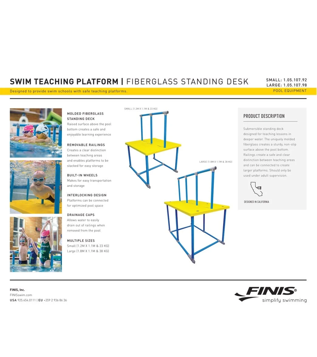 FINISThe FINIS Swim Teaching Platform 1.8m x 1.1m makes it possible for deep water pools to accommodate beginning swimmers. Providing a sturdy stopping point away from the wall makes it possible to accommodate larger groups of swimmers in pools without shallow ends or stairs.