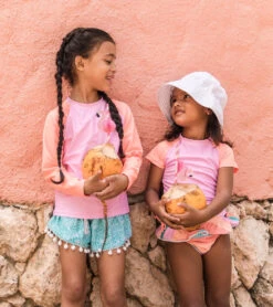 Rock pool and sea shore exploring are perfect in The Spearmint Spot Swim Shorts. Featuring The minty fresh Spearmint Spot print, and white pom pom trim details.