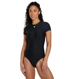 Radiate confidence when step onto the swim scene in the cute stylings of the Next by Athena Good Karma Malibu Zip Short Sleeve One Piece Swimsuit. Made out of functional fabric that’s perfect for all kinds of beach activities, you’ll love having this as a part of your water wardrobe.