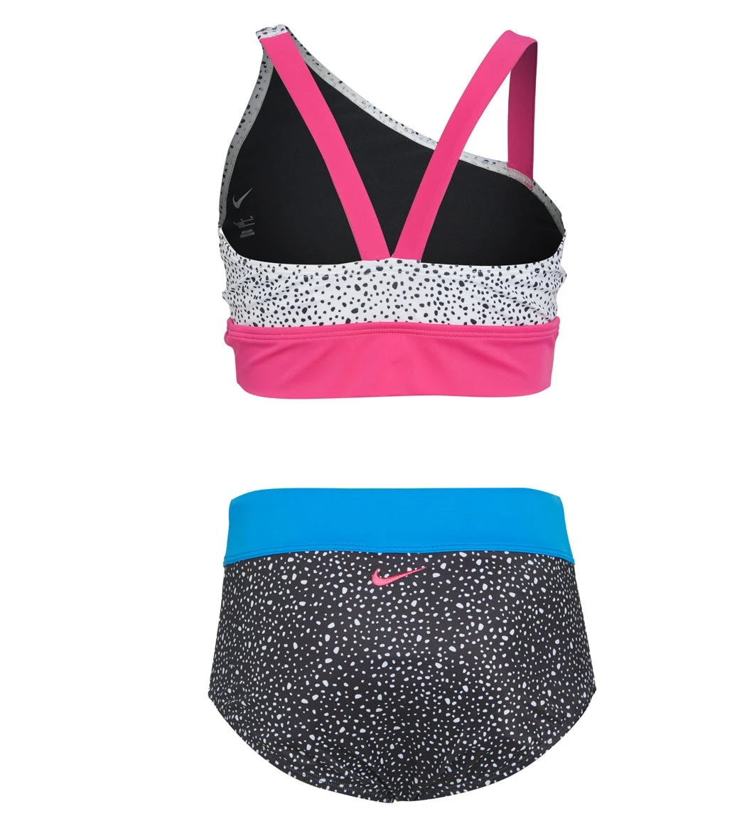 The Nike Girls’ Water Dots Asymmetrical Top & High Waist Bikini Set (Big Kid) is a cool and contemporary addition to her swimwear collection.