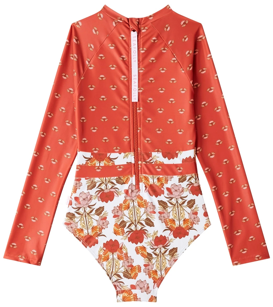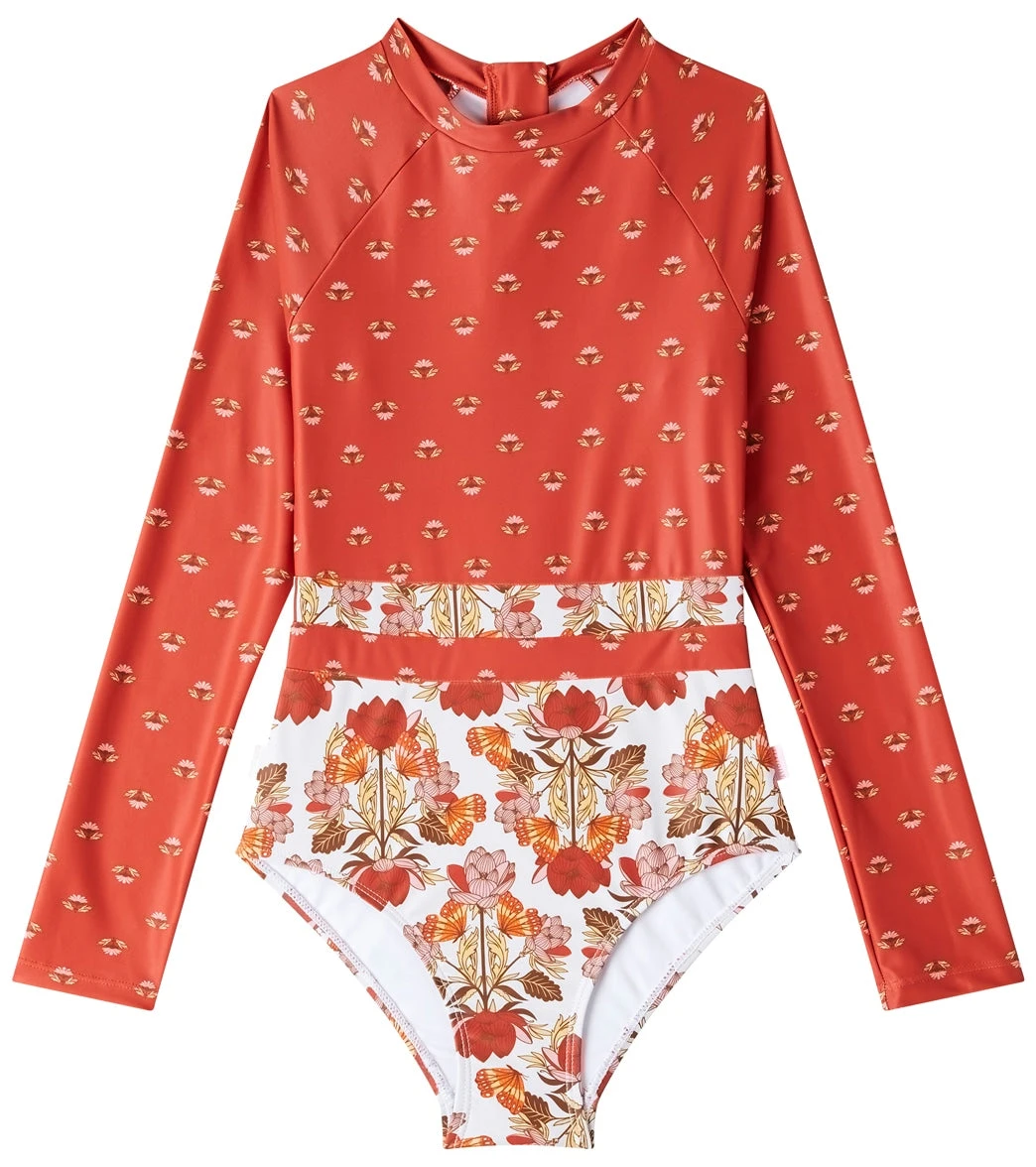 Your little one will look darling in the warmly colored Seafolly Girls’ Papillon Splice Long Sleeve One Piece Swimsuit (Big Kid).