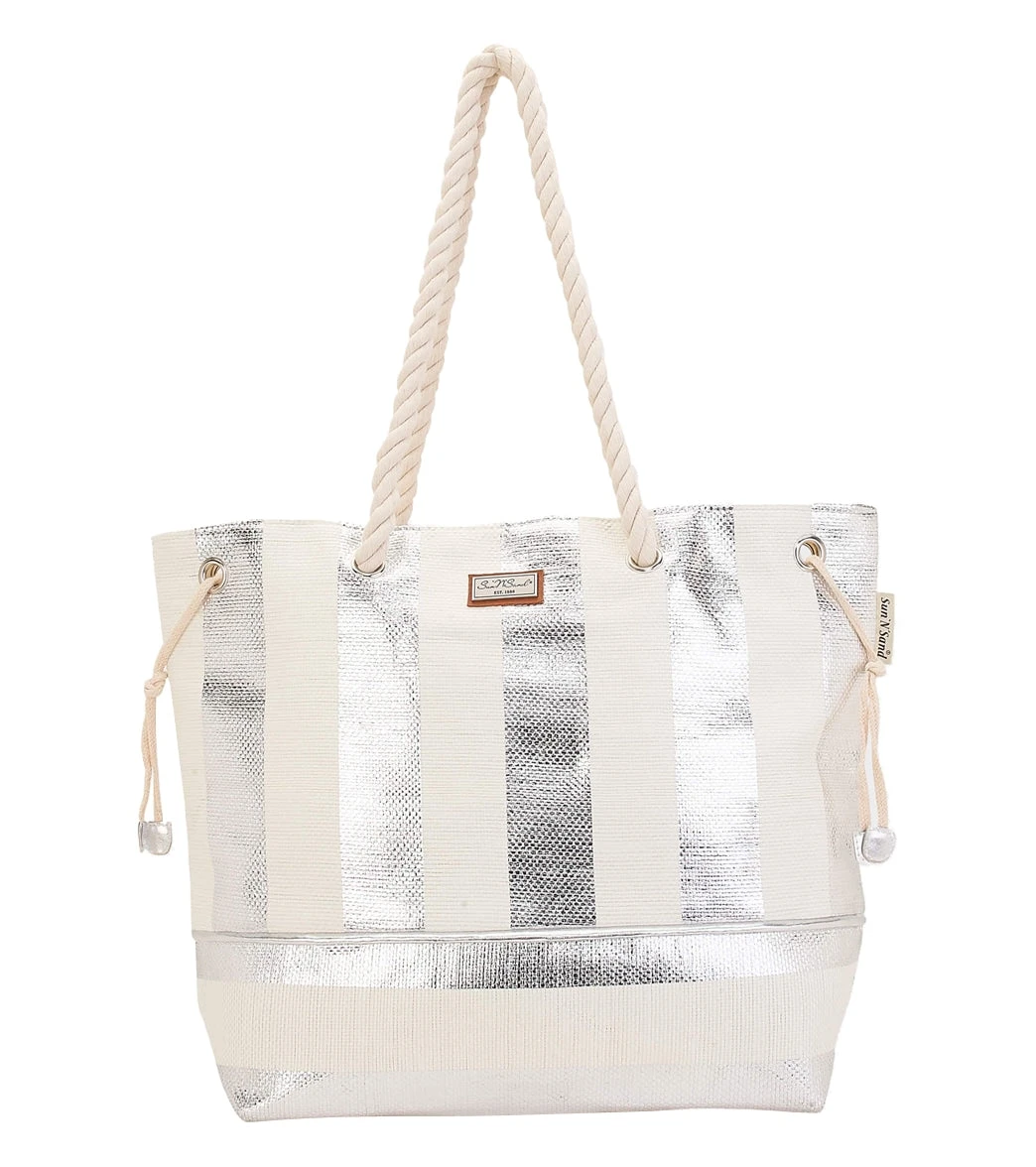 Sun N Sand Silver Metallic Striped Shoulder Tote