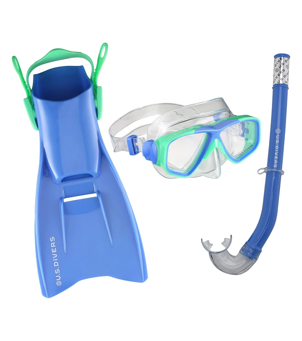 Enhance your kids snorkeling adventure with the U.S. Divers Tiki Jr Kids Snorkel Set. Featuring a shatter-resistant dual lenses, embedded anti-fog, and easy-adjust buckles, the Tiki Jr mask allows parents to quickly find the perfect fit for the kids. The Giraffe DX is an open barrel J snorkel that makes clearing any water that gets in easy. The Rip Fins feature adjustable straps designed to stretch to accommodate the kids’ feet as they grow. With the Tiki Jr Snorkeling Set, kids can easily go out and explore the local shores and start learning about the underwater world.